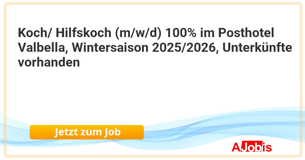 Alphotel Hirschegg - Hirschegg (Kleinwalsertal) [26.10.2025] -- Wir suchen einen Chef de Partie für unser einzigartiges Familienhotel im Kleinwalsertal ab 13.12.2025 Anstellungsart: Vollzeit Zubereitung von Speisen auf unterschiedlichen Posten Selbstständiges und wirtschaftliches Arbeiten Kontrolle der Wareneingangslieferung... |