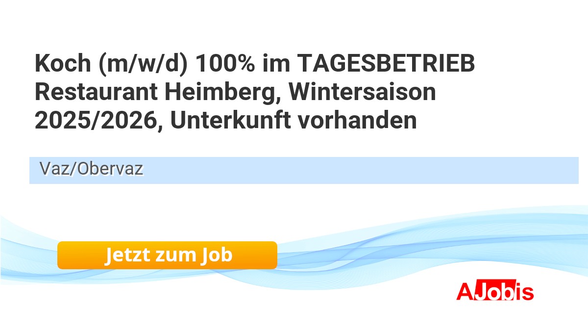 Koch (m/w/d) 100% im TAGESBETRIEB Restaurant Heimberg, Wintersaison 2025/2026, Unterkunft vorhanden* Alpin Trend Hotel & Gastro AG - Vaz/Obervaz[06.11.2025] --Jeden Tag aus Überzeugung! Einleitung Das Restaurant Heimberg ist ein Betrieb der AlpinTrend-Gruppe. Das Restaurant liegt mitten in der Natur, direkt an der Skipiste in Parpan, auf der Rothornseite des Wintersportsgebiets Arosa-Lenzerheide. Seit 2021 öffnet das Restaurant... |