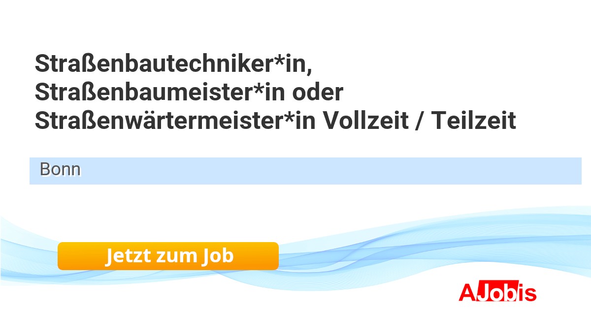 Bundesstadt Bonn - Bonn [30.11.2025] -- Die Bundesstadt Bonn hat zum nächstmöglichen Zeitpunkt für das Tiefbauamt eine Stelle als Straßenbautechniker*in, Straßenbaumeister*in oder Straßenwärtermeister*in- Entgeltgruppe 9 b TVöD -für den Bereich Straßenunterhaltung unbefristet zu besetzen Die... |