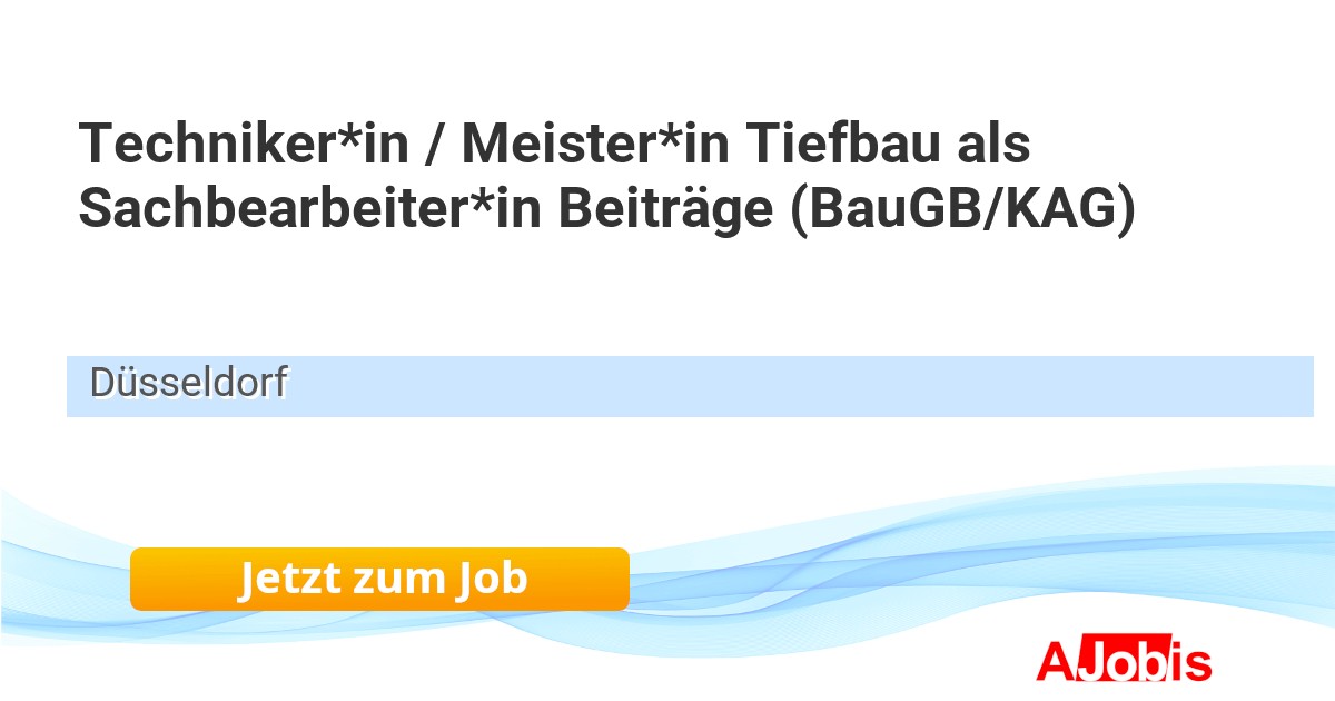 |   |  Landeshauptstadt Düsseldorf - Düsseldorf [22.10.2025] --.... zum nächstmöglichen Zeitpunkt Techniker*in / Meister*in Tiefbau als Sachbearbeiter*in Beiträge (BauGB/KAG) für das Amt für Verkehrsmanagement EG 9b TVöD Das Amt für Verkehrsmanagement ist mit derzeit rund 350 Stellen eines der größten Ämter der Landeshauptstadt... |