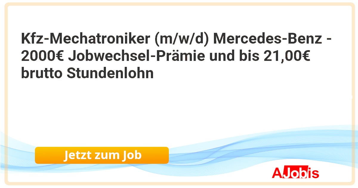 Kfz-Mechatroniker (m/w/d) Mercedes-Benz - 2000€ Jobwechsel-Prämie und bis 21,00€ brutto Stundenlohn* Schloz Wöllenstein GmbH & Co. KG - Kippenheim[07.11.2025] --Willkommen bei Mercedes-Benz Schloz Wöllenstein - menschlich und kompetent. Für und von Persönlichkeiten, die Autos lieben. Wir sind Mercedes-Benz Vertragspartner und in unserer Werkstatt in Kippenheim kannst du deiner Leidenschaft für Automobile nachgehen. Entfalte deine... |