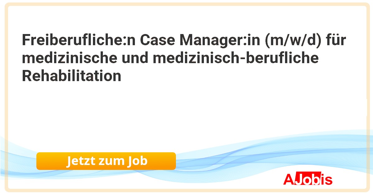 Freiberufliche:n Case Manager:in (m/w/d) für medizinische und medizinisch-berufliche Rehabilitation* RehaCare GmbH - Hamburg, Bremen[06.11.2025] --Wir von der RehaCare GmbH leben die Idee, unfallgeschädigten Menschen zu helfen, wieder zurück ins Leben zu finden. Seit über 25 Jahren sind wir damit sehr erfolgreich. Wir sind mit 70 Kolleg:innen an 32 Standorten deutschlandweit aktiv. In den Großräumen Berlin sowie... |