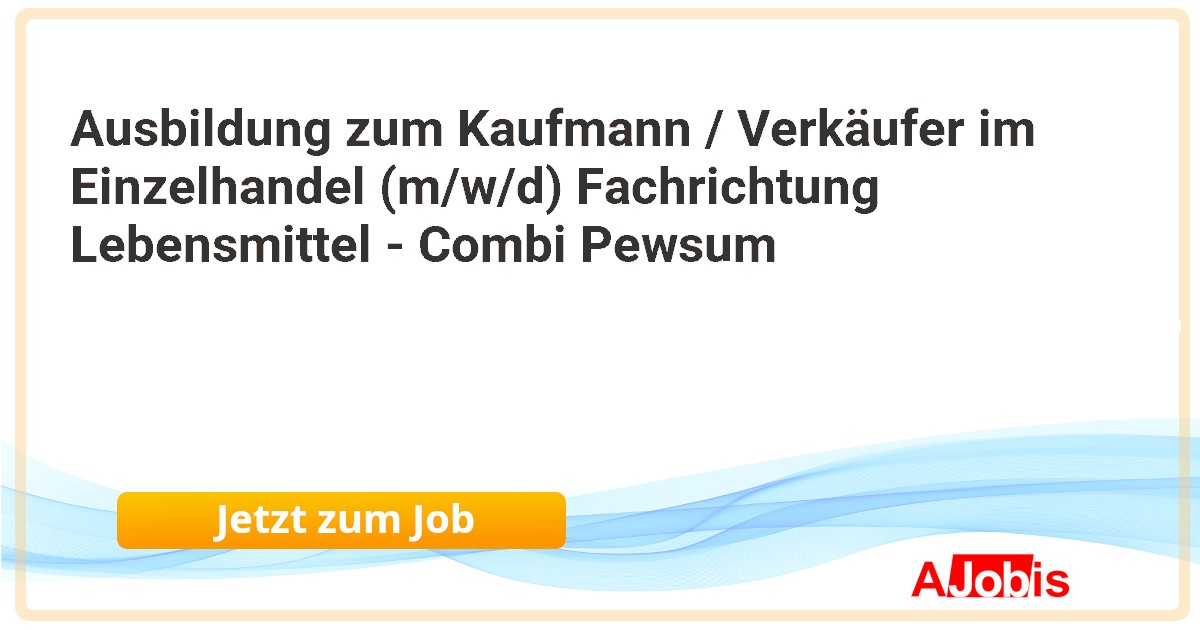 Ausbildung zum Kaufmann / Verkäufer im Einzelhandel (m/w/d) Fachrichtung Lebensmittel - Combi Pewsum Combi Verbrauchermarkt Einkaufsstätte GmbH & Co. KG - Krummhörn Pewsum[30.11.2025] --Combi ist ein dynamisch wachsendes Handelsunternehmen der Bünting Unternehmensgruppe mit einem dichten Netz von Verbrauchermärkten in Nordwestdeutschland. Unser Schwerpunkt liegt auf dem Lebensmittel- und Frischebereich sowie auf leistungsstarken Fachmietern.Ob frisches Obst... |