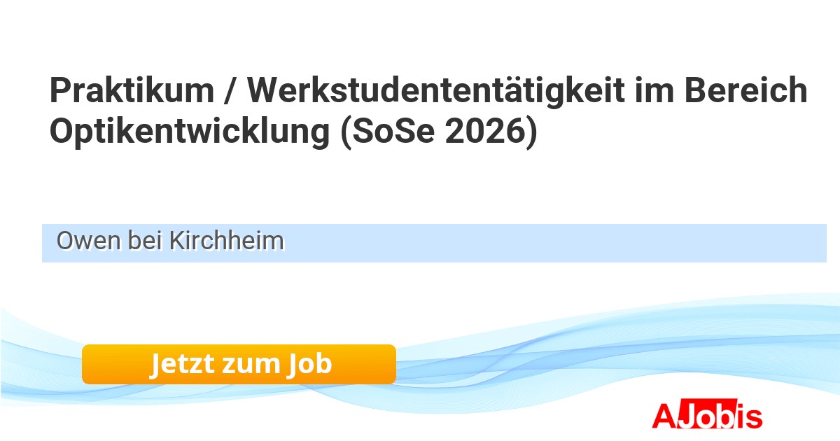 Leuze electronic GmbH + Co. KG - Owen bei Kirchheim [22.11.2025] --Praktikum / Werkstudententätigkeit im Bereich Optikentwicklung (SoSe 2026) Bereich: Research & Development Standort: Owen bei Kirchheim / Teck Beschäftigungsart: Praktikum Wer sind die Sensor People Über 60 Jahre Erfahrung haben Leuze zum Experten für innovative und... |