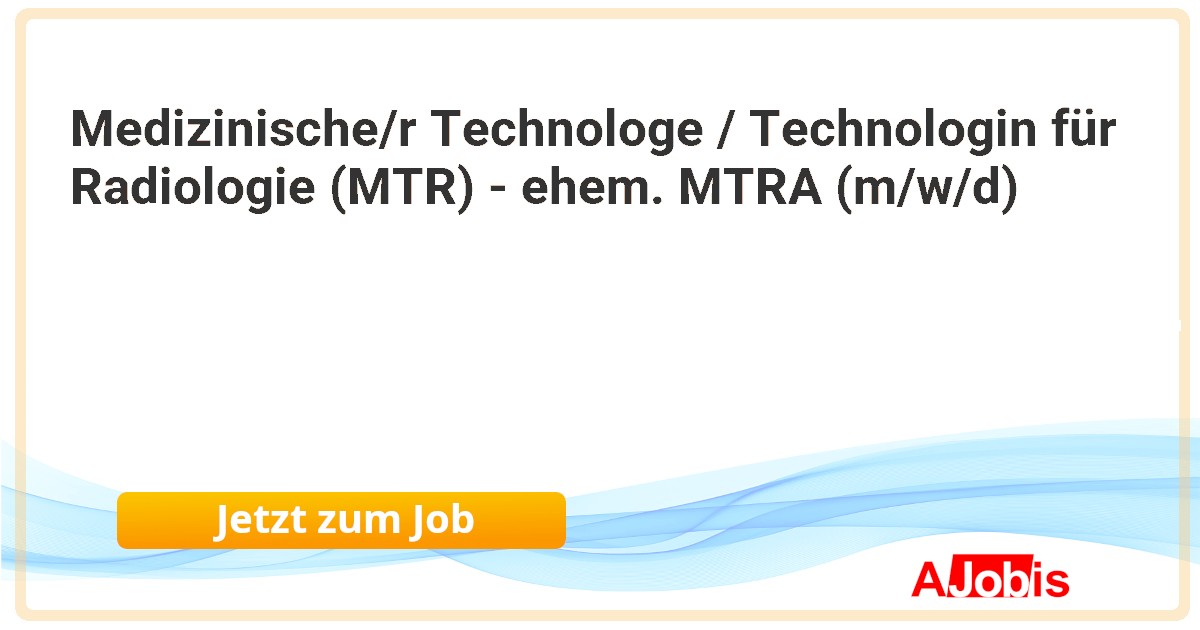 |   |  Klinikum Oldenburg AöR - Oldenburg [30.10.2025] --für unser Universitätsinstitut für Diagnostische und Interventionelle Radiologie zum frühestmöglichen Eintrittstermin eine / einen Medizinische Technologin / Medizinischen Technologen für Radiologie (MTR) (w/m/d) in Voll- oder Teilzeit  Das Universitätsinstitut für... |