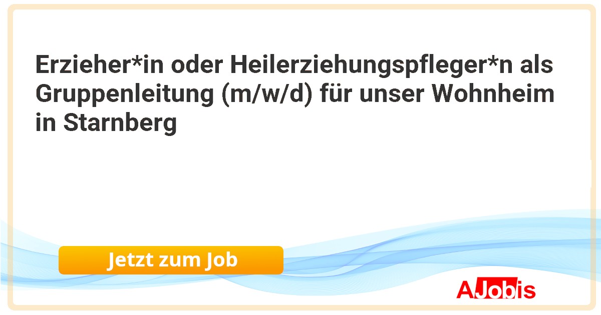 Erzieher*in oder Heilerziehungspfleger*n als Gruppenleitung (m/w/d) für unser Wohnheim in Starnberg* Lebenshilfe Starnberg gemeinnützige GmbH - Starnberg[11.11.2025] -- Wo Zuversicht eine Zukunft hat Erzieher*in oder Heilerziehungspfleger*n als Gruppenleitung (m/w/d) für unser Wohnheim in Starnberg Du willst als Gruppenleitung (m/w/d) Verantwortung übernehmen und Menschen mit geistiger Behinderung auf ihrem Weg zu mehr Selbstbestimmung... |