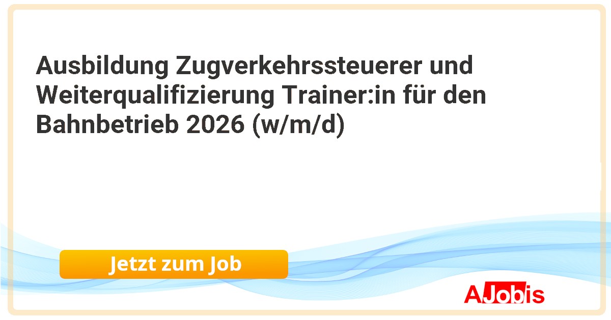 Ausbildung Zugverkehrssteuerer und Weiterqualifizierung Trainer:in für den Bahnbetrieb 2026 (w/m/d)* Deutsche Bahn AG Region Südwest - Karlsruhe[07.11.2025] --Die Deutsche Bahn ist eine der vielfältigsten Arbeitgeber:innen Deutschlands. Wir suchen jedes Jahr deutschlandweit über 5.000 Auszubildende in 50 Berufen, die mit uns gemeinsam noch besser werden wollen.... |