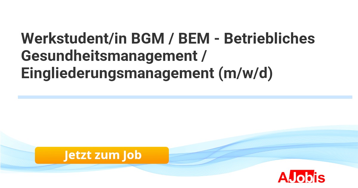 CEVA Logistics GmbH - Hamburg [24.11.2025] -- Werkstudent/in BGM / BEM - Betriebliches Gesundheitsmanagement / Eingliederungsmanagement (m/w/d) CEVA Logistics verbindet weltweit Menschen, Produkte und Anbieter. Mit über 110.000 Mitarbeitenden in 130 Ländern streben wir danach, einer der Top-5-Kontraktlogistikanbieter... |
