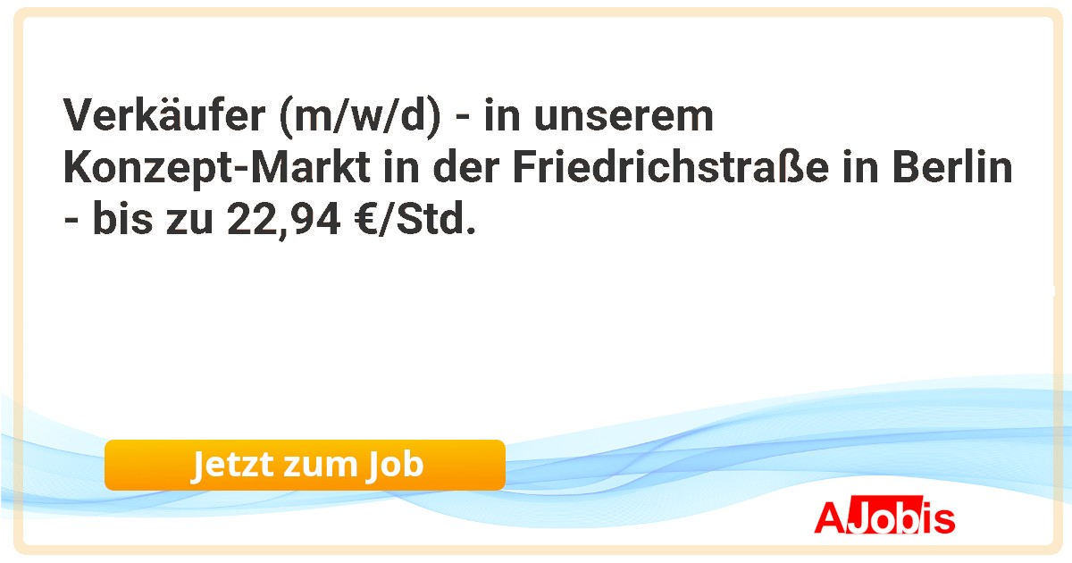 Verkäufer (m/w/d) - in unserem Konzept-Markt in der Friedrichstraße in Berlin - bis zu 22,94 €/Std.* ALDI Nord - Berlin[23.11.2025] --Die Unternehmensgruppe ALDI Nord ist einer der führenden Lebensmitteleinzelhändler. Mit einer Tradition von über 110 Jahren steht ALDI für die Erfindung des Discount-Prinzips. Unsere Mission ist es, Menschen überall und jederzeit mit dem zu versorgen, was sie für ihr... |