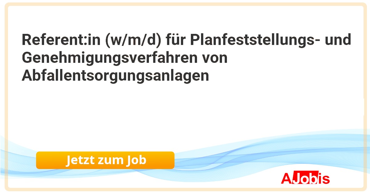 Die Senatorin für Umwelt, Klima und Wissenschaft - Bremen [27.11.2025] --Für unser Referat 23 „Kreislauf- und Abfallwirtschaft“ in der Abteilung 2 „Technischer Umweltschutz, Naturschutz und Grünflächen“ suchen wir zum nächstmöglichen Zeitpunkt ein:e Referent:in (w/m/d) für Planfeststellungs- und Genehmigungsverfahren von... |
