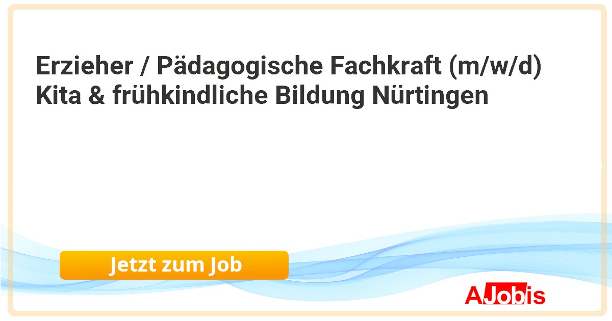 Stadt Nürtingen - Nürtingen [08.11.2025] -- Die Stadt Nürtingen sucht zum nächstmöglichen Zeitpunkt Erzieher / Pädagogische Fachkraft (m/w/d) Kita & frühkindliche Bildung Nürtingen für unterschiedliche städtische Kitas in Voll- und Teilzeit. WIR suchen kreative Köpfe, die mit unseren pfiffigen... |