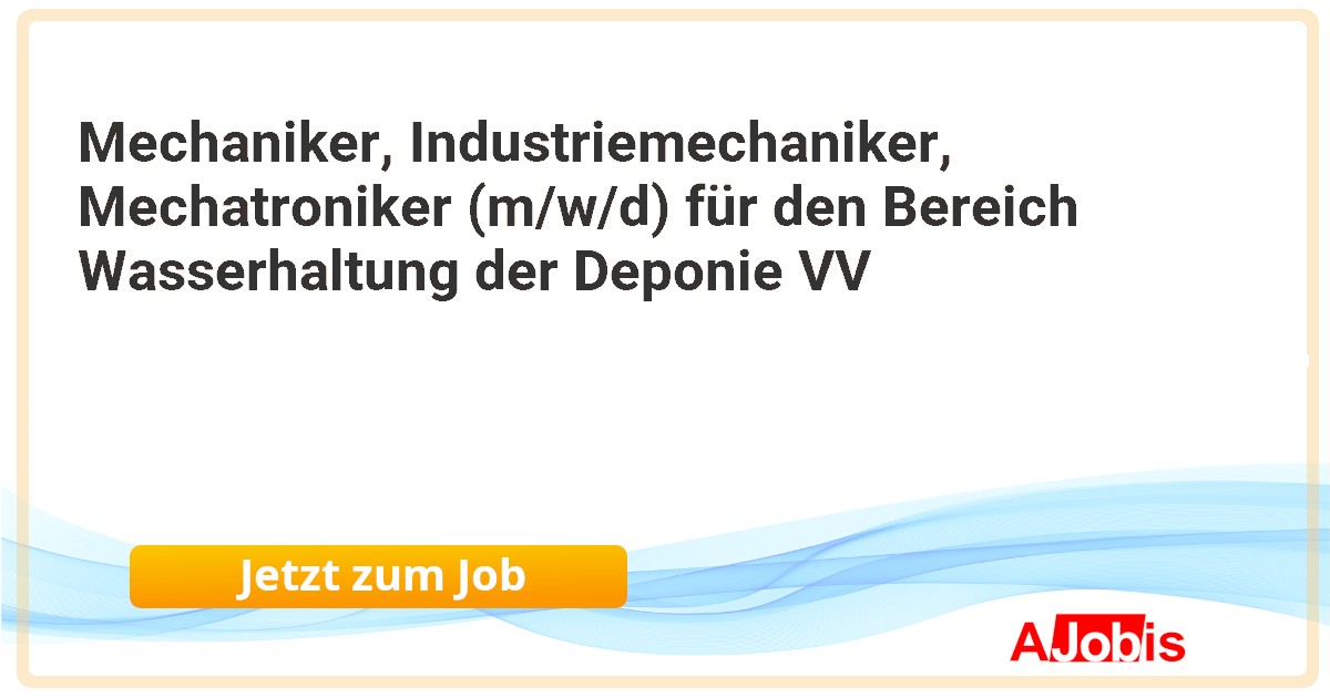Mechaniker, Industriemechaniker, Mechatroniker (m/w/d) für den Bereich Wasserhaltung der Deponie VV* AVG Abfallentsorgungs- und Verwertungsgesellschaft Köln mbH - Erftstadt-Liblar[26.11.2025] --Installation, Reparatur und Instandhaltung Anlagentechnik gemäß gesetzlicher Richtlinien