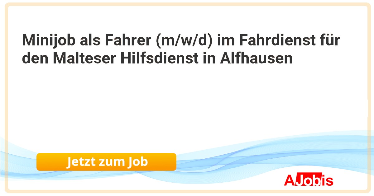 Malteser in Deutschland - Alfhausen [24.11.2025] --Als wichtiger Teil des Malteser Hilfsdienst trägst Du einen großen Teil dazu bei, hilfsbedürftige Menschen zu unterstützen und ihnen ein mobiles Leben zu ermöglichen. Mit unseren Malteser Fahrzeugen bringst Du Menschen mit geistigen und körperlichen Einschränkungen... |