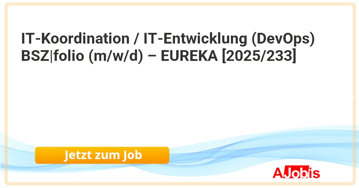 Bibliotheksservice-Zentrums Baden-Württemberg (BSZ) - Konstanz [23.11.2025] --Zum Hauptinhalt springen Die Stelle ist zum nächstmöglichen Zeitpunkt zu besetzen. Sie ist zunächst auf drei Jahre befristet. Eine Verlängerung wird angestrebt. Die Stelle ist grundsätzlich teilbar. IT-Koordination / IT-Entwicklung (DevOps) BSZ|folio (m/w/d) – EUREKA... |