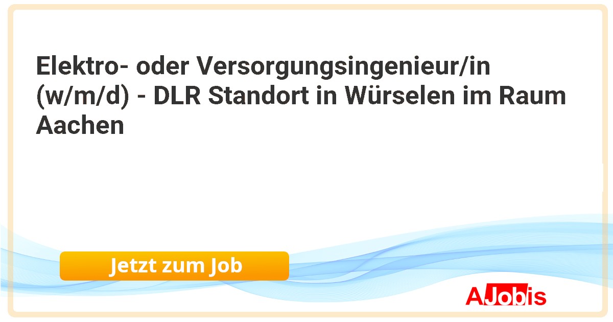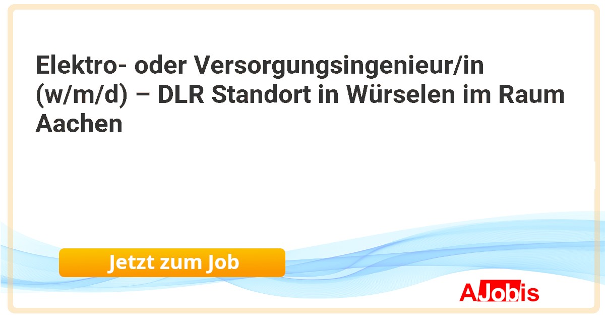 Deutsches Zentrum für Luft- und Raumfahrt e. V. - Aachen [07.11.2025] -- Join our fascination Gestalte die Welt von morgen. Bildnachweis: DLR Alle Rechte vorbehalten Elektro- oder Versorgungsingenieur/in (w/m/d) – DLR Standort in Würselen im Raum Aachen Kennziffer: 2821 Arbeitsort: Aachen Eintrittsdatum: 01.02.2026 Karrierestufe:... |