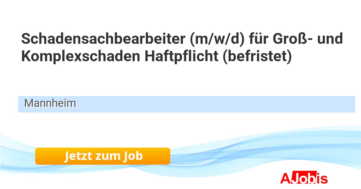 Mannheimer Versicherung AG - Mannheim [06.11.2025] --Schadensachbearbeiter (m/w/d) für Groß- und Komplexschaden Haftpflicht (befristet) Mannheim befristet Teilzeit (19 Stunden/Woche) Unsere Mitarbeitenden – motivierte Menschen, die zu uns passen. Denn wir geben ihnen Raum, damit sie ihre individuellen Stärken... |