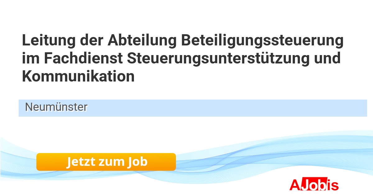 Leitung der Abteilung Beteiligungssteuerung im Fachdienst Steuerungsunterstützung und Kommunikation* Stadt Neumünster - Neumünster[24.11.2025] --Die Stadt Neumünster ist Arbeitgeberin für 1.700 Mitarbeiterinnen und Mitarbeiter. Gemeinsam gestalten wir täglich das Leben für die Menschen in unserer Stadt. Die Stadt Neumünster wurde als 'Top Nationaler Arbeitgeber 2025' von Focus ausgezeichnet. Wir... |