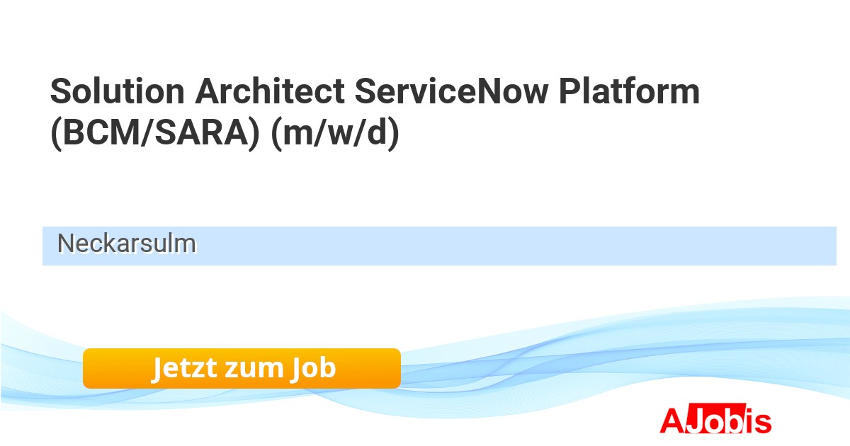 Schwarz IT - Neckarsulm [24.11.2025] -- Solution Architect ServiceNow Platform (BCM/SARA) Standort: Neckarsulm Abteilung / Bereich: Level: Berufserfahrene Referenznummer: 767 Die Schwarz IT betreut die gesamte digitale Infrastruktur und alle Softwarelösungen der Unternehmen der Schwarz Gruppe. Sie... |