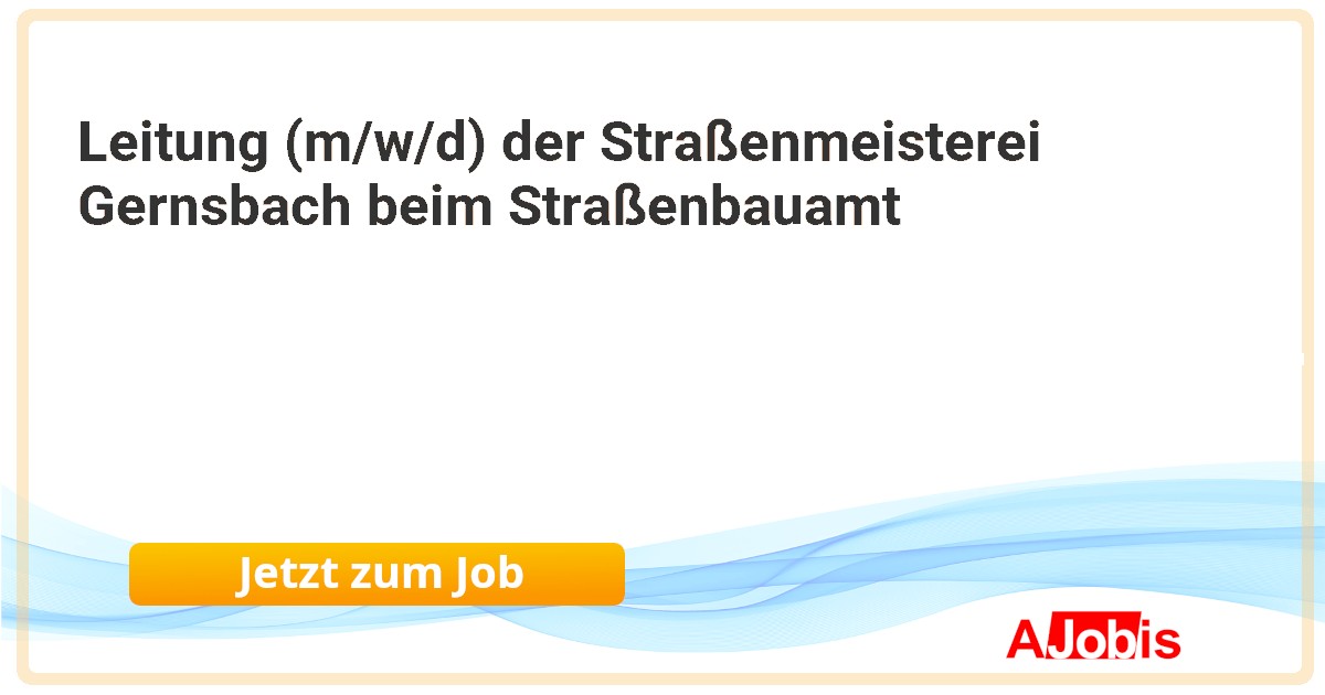 Landratsamt Rastatt Amt für Personal, Organisation und Digitalisierung - Rastatt [24.11.2025] --Die Leitung der Straßenmeisterei Gernsbach trägt die Verantwortung für den Straßenbetriebs- und Winterdienst sowie die Verkehrssicherungspflicht an Bundes-, Landes- und Kreisstraßen im betreuten Straßennetz sowie Budgetverantwortung / Controlling im... |