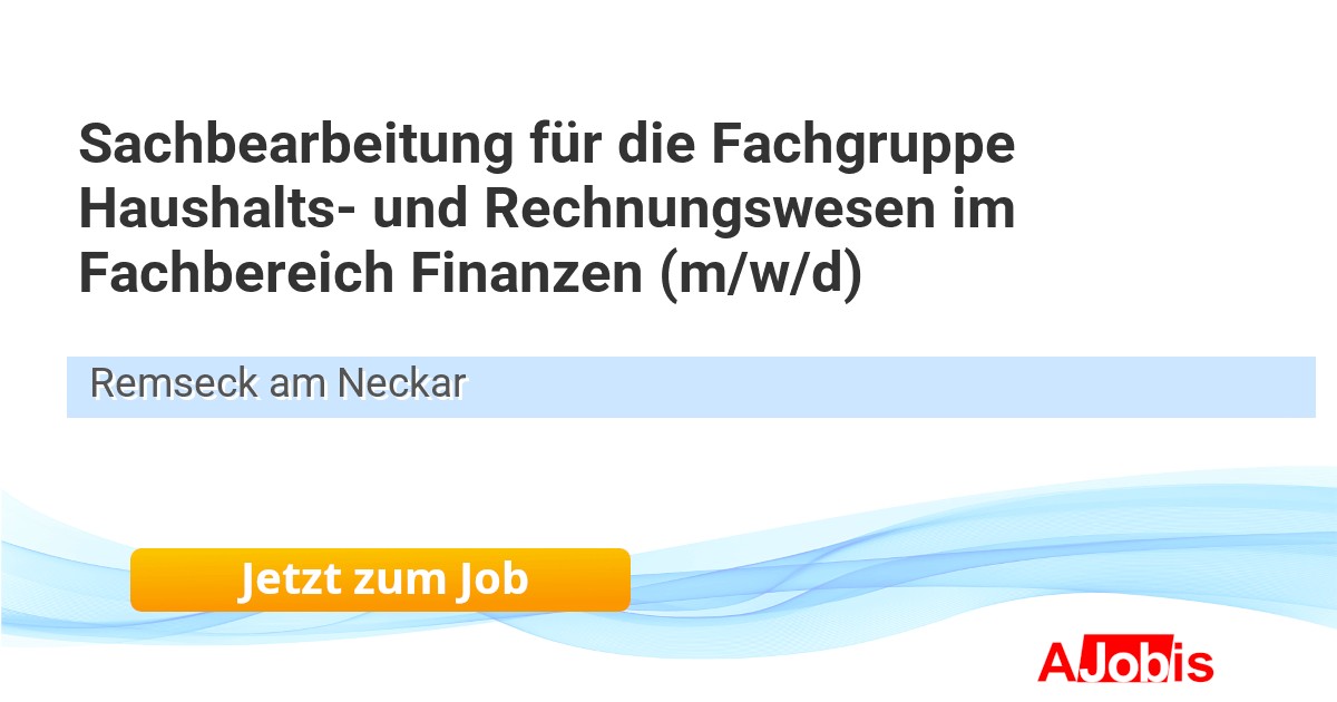 Stadt Remseck am Neckar - Remseck am Neckar [29.11.2025] --Sachbearbeitung für die Fachgruppe Haushalts- und Rechnungswesen im Fachbereich Finanzen (W/M/D) 01.01.2026Teilzeit Entgeltgruppe 8 Du denkst im Bereich des kommunalen Finanzwesens einen Zug voraus und hast ein gutes Zahlenverständnis? Dann bist Du bei uns richtig und wir... |