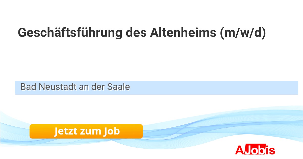 Stiftungs- Alten- und Pflegeheim Bad Neustadt gGmbH - Bad Neustadt an der Saale [28.11.2025] --Die Stiftungs- Alten- und Pflegeheim Bad Neustadt gGmbH sucht zum nächstmöglichen Zeitpunkt eine Geschäftsführung des Altenheims (m/w/d). Die Stelle ist nicht teilzeitgeeignet. Was Sie erwartet: Geschäftsführung mit kaufmännischer Verantwortung Erstellung... |