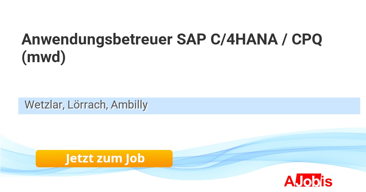 Vesterling AG - Wetzlar, Lörrach, Ambilly [24.11.2025] --Als Anwendungsbetreuer SAP C/4HANA / CPQ leiten Sie die Entwicklung und technische Umsetzung von Projekten im Bereich SAP C/4HANA. Unser Klient steht weltweit für innovative und individuelle technische Lösungen, für technologische Perfektion, kompetente Beratung und... |