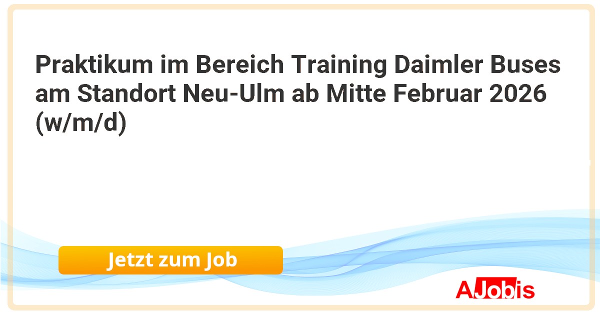 Praktikum – internationale Kommunikation und Projektmanagement Daimler Buses Customer Portal (w/m/d) Daimler Buses GmbH - Neu-Ulm[27.11.2025] --Bei Daimler Truck wollen wir das heutige Transportwesen verändern, um gemeinsam etwas zu bewirken. Darum übernehmen wir weltweit Verantwortung und arbeiten als ein globales Team gemeinsam an unserer Vision: Leading Sustainable Transportation. Es sind die Menschen, die bei uns... |