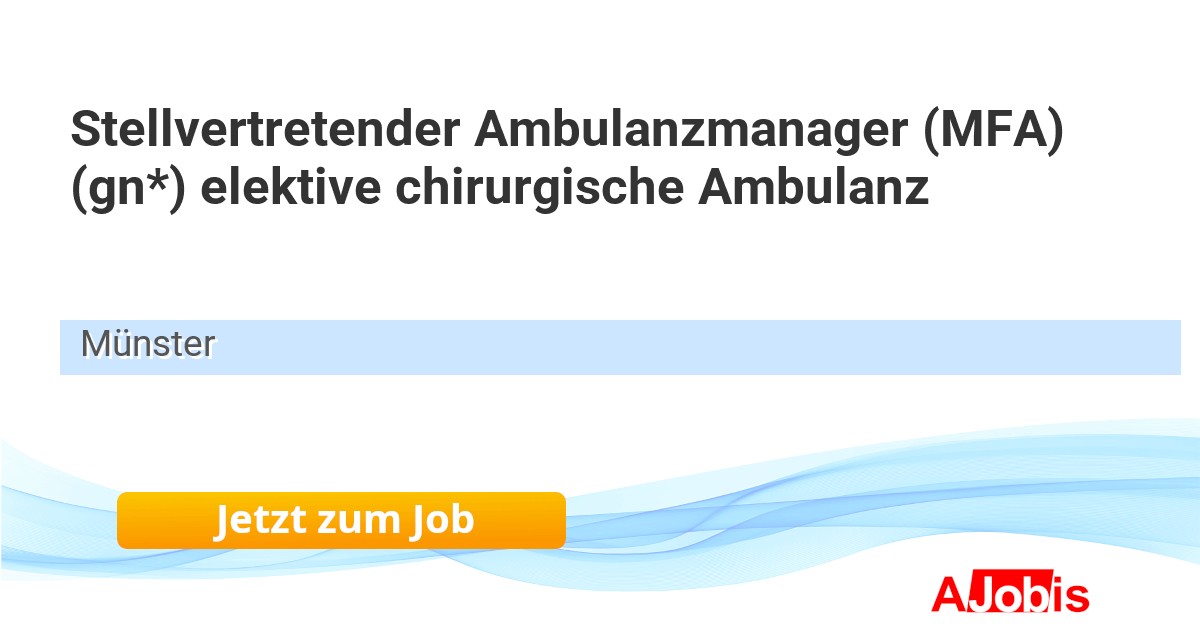 UKM Universitätsklinikum Münster - Münster [06.11.2025] --Stellvertretender Ambulanzmanager (MFA) (gn*) elektive chirurgische Ambulanz Unbefristet | In Voll- oder Teilzeit mit bis zu 38,5 Wochenstunden| Geschäftsbereich Ambulanz- und Patientenmanagement | Ambulanzen der Allgemein-, Viszeral- und Transplantationschirurgie; Unfall-... |