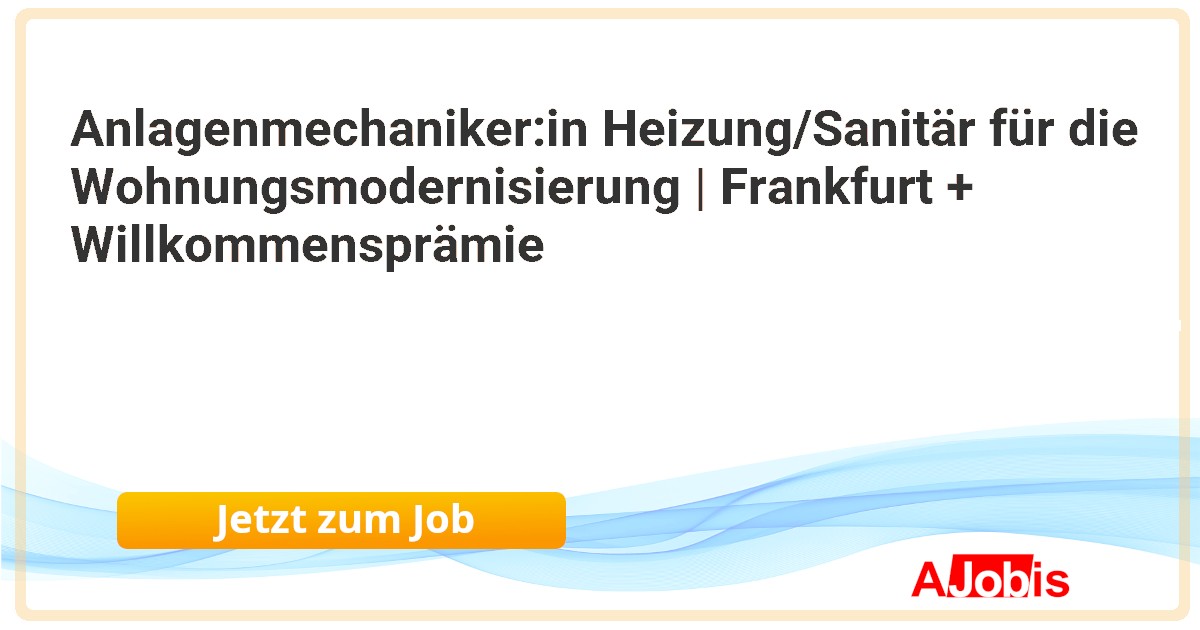 Anlagenmechaniker:in Heizung/Sanitär für die Wohnungsmodernisierung | Frankfurt + Willkommensprämie* Vonovia - Frankfurt[26.11.2025] --Als Teil des Wohnungskonzerns Vonovia SE sorgen wir mit rund 4.000 Mitarbeiter:innen des Technischen Service an 47 Standorten in ganz Deutschland dafür, dass in unseren Wohngebäuden alles fachgerecht instandgehalten wird. Ob Installationen, Reparaturen, Wartungen... |